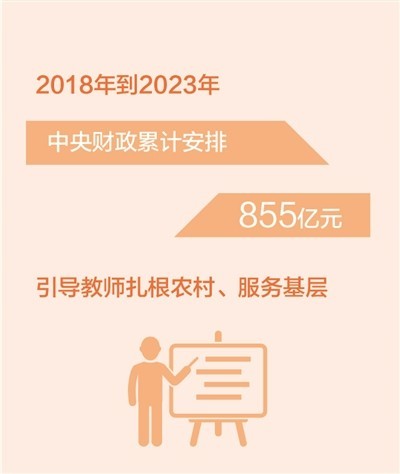 2018年到2023年中央財政累計安排855億元引導(dǎo)教師扎根農(nóng)村、服務(wù)基層