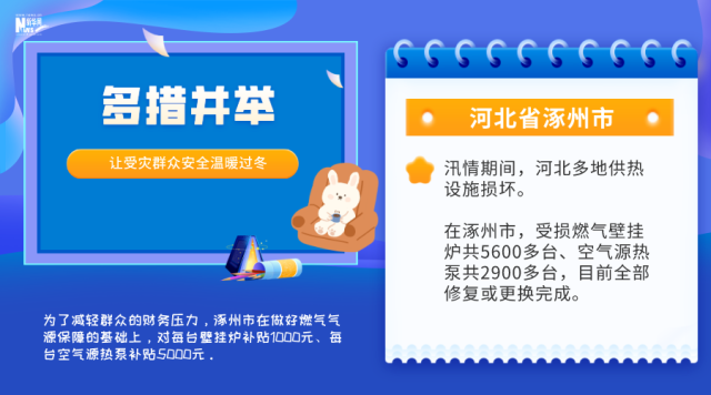 汛情期間,河北多地供熱設(shè)施損壞。在涿州市,受損燃?xì)獗趻鞝t共5600多臺(tái)、空氣源熱泵共2900多臺(tái),目前全部修復(fù)或更換完成。為了減輕群眾的財(cái)務(wù)壓力,涿州市在做好燃?xì)鈿庠幢U系幕A(chǔ)上,對(duì)每臺(tái)壁掛爐補(bǔ)貼1000元、每臺(tái)空氣源熱泵補(bǔ)貼5000元。在河北保定淶水縣,10個(gè)位于山區(qū)、丘陵的鄉(xiāng)鎮(zhèn)今冬要使用潔凈煤取暖,預(yù)計(jì)使用量在5.1萬噸左右。淶水縣督促相關(guān)企業(yè),早謀劃、早對(duì)接、早儲(chǔ)備,組織車輛加快配送,確保供得上、供得及時(shí)。