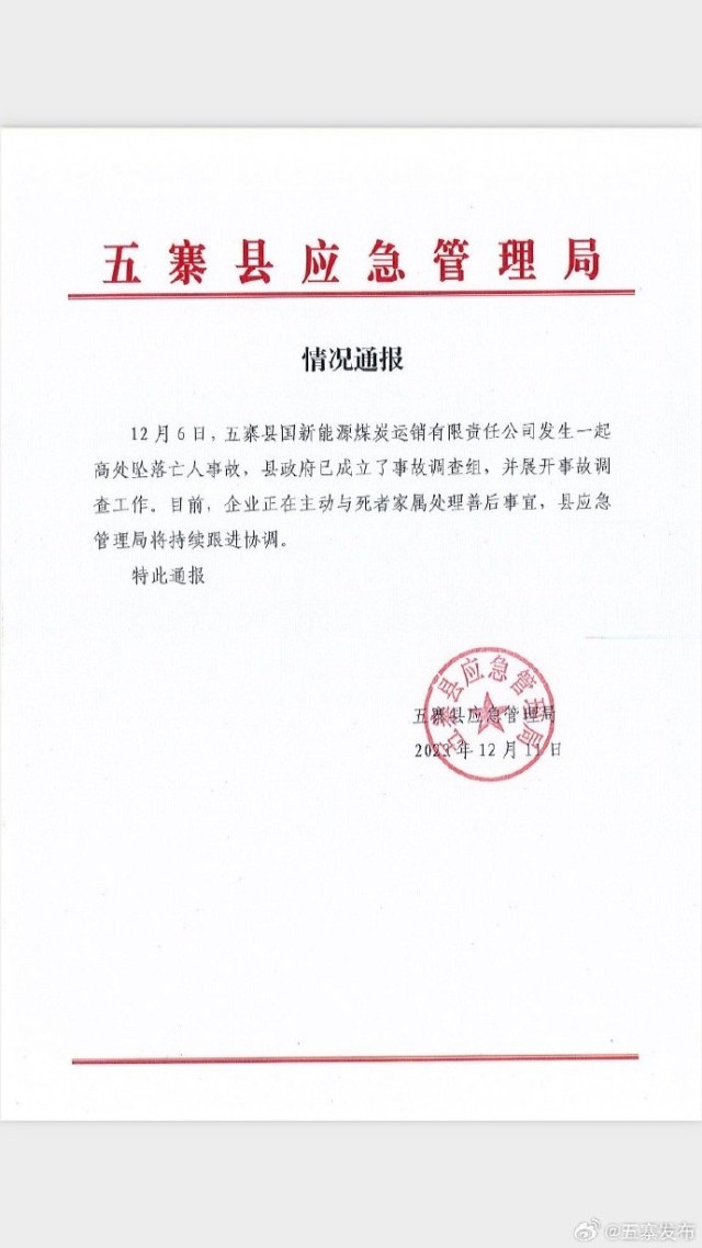 國新能源煤炭運銷公司發(fā)生墜亡事故 山西省忻州市五寨縣官方:展開調(diào)查