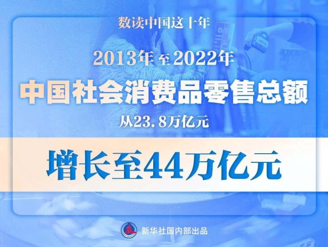 2013年至2022年10年間,中國社會消費品零售總額從23.8萬億元增長至44萬億元,穩(wěn)居全球第二大消費市場、第一大網(wǎng)絡(luò)零售市場和全球第二大進(jìn)口市場。消費“主引擎”動力強(qiáng)勁,為推動高質(zhì)量發(fā)展、創(chuàng)造高品質(zhì)生活、構(gòu)建新發(fā)展格局提供有力支撐。