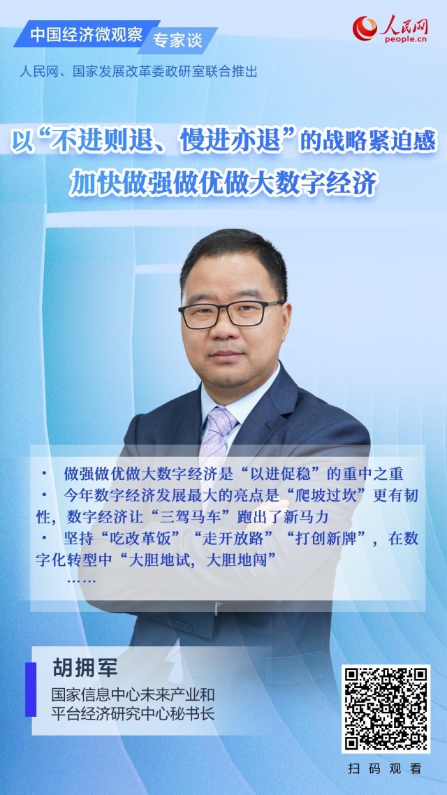 近日,國家信息中心未來產(chǎn)業(yè)和平臺經(jīng)濟研究中心秘書長胡擁軍做客《中國經(jīng)濟微觀察·專家談》欄目時表示,“以進促穩(wěn)”是中央經(jīng)濟工作會議釋放的最鮮明的積極信號之一,從經(jīng)濟回升向好的趨勢、潛力、基礎(chǔ)來看,做強做優(yōu)做大數(shù)字經(jīng)濟是“以進促穩(wěn)”的重中之重。