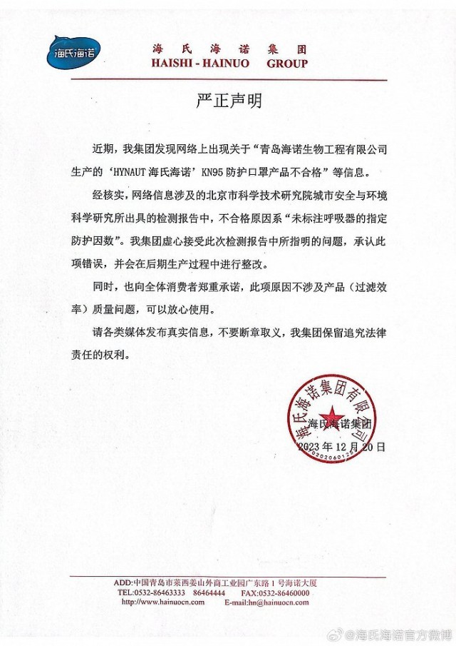 央視網(wǎng)消息:據(jù)海氏海諾官方微博發(fā)布聲明稱,近期,集團(tuán)發(fā)現(xiàn)網(wǎng)絡(luò)上出現(xiàn)關(guān)于“青島海諾生物工程有限公司生產(chǎn)的‘HYNAUT 海氏海諾’KN95防護(hù)口罩產(chǎn)品不合格”等信息。經(jīng)核實(shí),網(wǎng)絡(luò)信息涉及的北京市科學(xué)技術(shù)研究院城市安全與環(huán)境科學(xué)研究所出具的檢測報(bào)告中,不合格原因系“未標(biāo)注呼吸器的指定防護(hù)因數(shù)”。海氏海諾表示,虛心接受此次檢測報(bào)告中所指明的問題,承認(rèn)此項(xiàng)錯(cuò)誤,并會(huì)在后期生產(chǎn)過程中進(jìn)行整改。同時(shí),海氏海諾承諾,此項(xiàng)原因不涉及產(chǎn)品(過濾效率)質(zhì)量問題,可以放心使用。