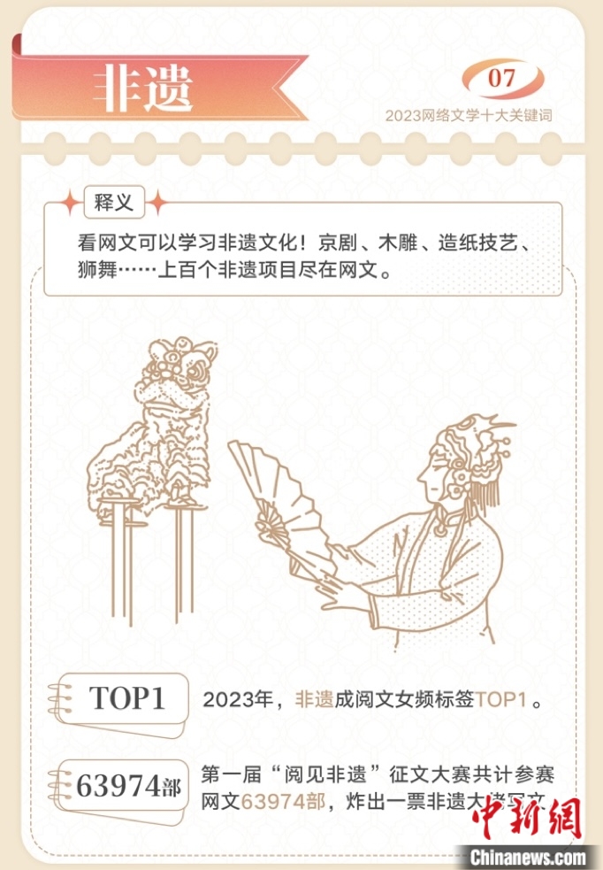 與此同時(shí),網(wǎng)絡(luò)文學(xué)在高質(zhì)量傳承傳統(tǒng)文化方面持續(xù)發(fā)力。京劇、木雕、造紙、獅舞……上百個(gè)非遺項(xiàng)目在網(wǎng)文中掀起“傳統(tǒng)文化熱”,“非遺”躍升為閱文女頻標(biāo)簽TOP1。
