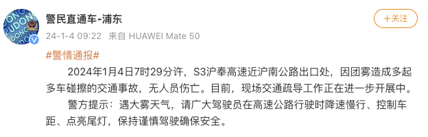 央視網(wǎng)消息:據(jù)警民直通車-浦東通報(bào),1月4日7時(shí)29分許,S3滬奉高速近滬南公路出口處,因團(tuán)霧造成多起多車碰擦的交通事故,無(wú)人員傷亡。目前,現(xiàn)場(chǎng)交通疏導(dǎo)工作正在進(jìn)一步開(kāi)展中。