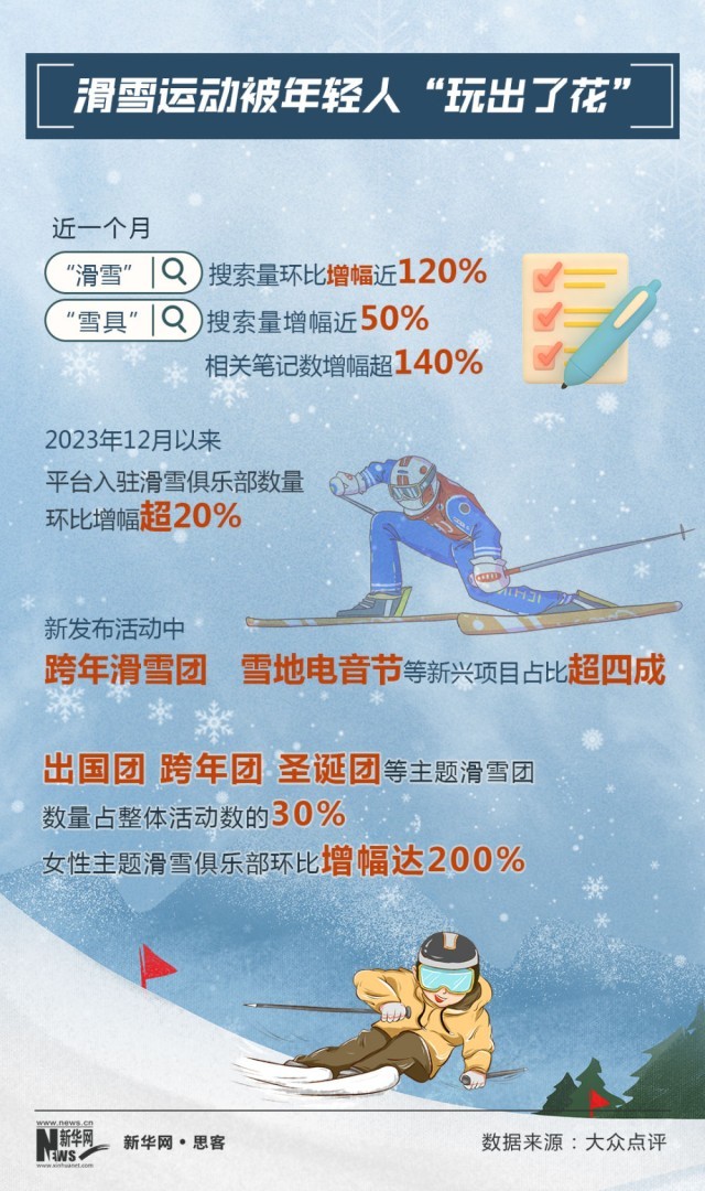 大眾點(diǎn)評(píng)數(shù)據(jù)顯示,2023年12月以來(lái),滑雪俱樂(lè)部入駐數(shù)量環(huán)比增幅超20%。新發(fā)布活動(dòng)中,雪地電音節(jié)、滑雪旅行團(tuán)等新興項(xiàng)目占比超四成。“滑雪”搜索量環(huán)比增幅近120%,“雪具”搜索量增幅近50%,相關(guān)筆記數(shù)增幅超140%。很多“95后”網(wǎng)友表示,自己一直都想滑雪,在網(wǎng)絡(luò)上看到一些“滑雪+電音節(jié)”的筆記攻略,被這種新穎的形式吸引,立刻“種草”。
