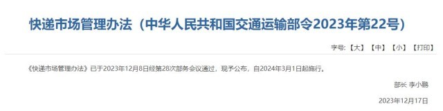 央視網(wǎng)消息:《快遞市場(chǎng)管理辦法》已于2023年12月8日經(jīng)第28次部務(wù)會(huì)議通過,現(xiàn)予公布,自2024年3月1日起施行。