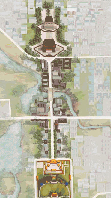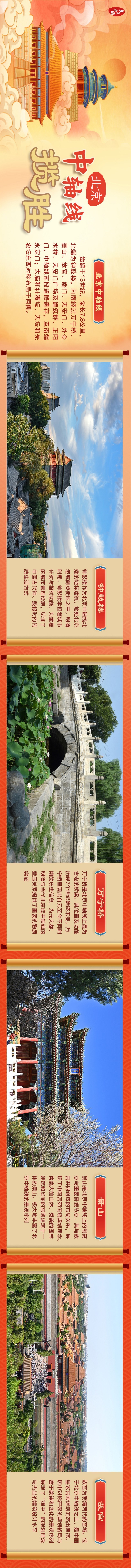 全長7.8公里的北京中軸線北端為鐘鼓樓,向南經(jīng)過萬寧橋、景山、故宮、端門、天安門、外金水橋、天安門廣場(chǎng)及建筑群、正陽門、中軸線南段道路遺存,至南端永定門;太廟和社稷壇、天壇和先農(nóng)壇東西對(duì)稱布局于兩側(cè)。
