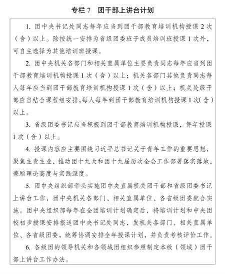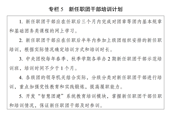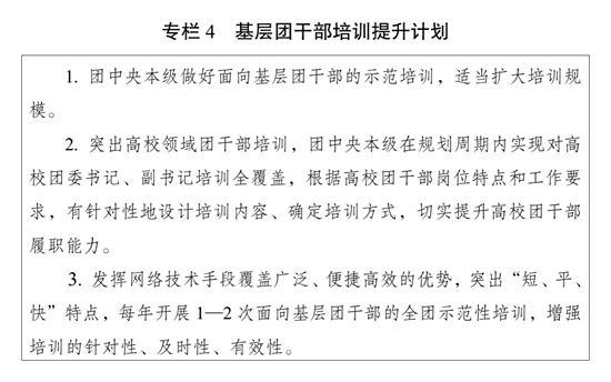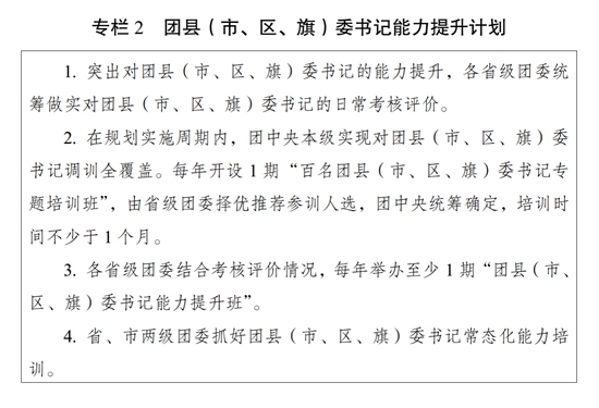 ?。ǘ┩怀觥瓣P鍵少數(shù)”政治訓練。堅持把政治訓練貫穿團干部成長全周期,使團干部的政治素養(yǎng)、政治能力與擔負的領導職責相匹配。強化“一把手”政治培訓,有計劃地選調團的各級領導機關主要負責同志到團干部教育培訓機構參加專題培訓。強化對團縣(市、區(qū)、旗)委書記這一群體的培訓,實施團縣(市、區(qū)、旗)委書記能力提升計劃(專欄2)。突出對團的領導機關干部的政治訓練,各級團的領導機關加強對機關干部的常態(tài)化政治能力培訓。加強對青年人才的政治引領,團中央組織部會同有關單位每年組織一定數(shù)量青年人才開展國情研修。積極推動將地方團的領導機關班子成員培訓納入地方黨委組織開展的干部政治理論培訓范疇。