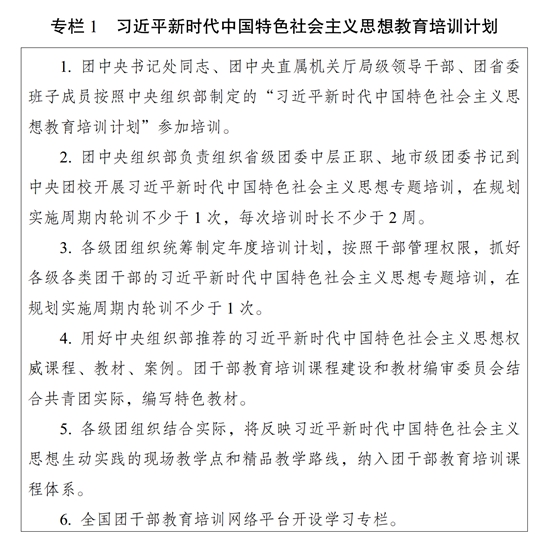 ?。ㄒ唬┚劢咕哿?,久久為功。完善團干部理論教育培訓長效機制,落實黨的創(chuàng)新理論學習教育計劃,組織實施習近平新時代中國特色社會主義思想教育培訓計劃(專欄1),系統(tǒng)謀劃、持續(xù)用力,不斷把思想鑄魂、理論武裝工作引向深入。堅持把習近平新時代中國特色社會主義思想作為團的各級領導機關班子成員理論學習中心組學習首要內容,作出具體安排、精心組織實施;作為各級團干部教育培訓機構的主課必修課,辦好理論進修班、理論研修班;作為團干部學習的中心內容,全面系統(tǒng)學、持續(xù)深入學、聯(lián)系實際學。以縣處級及以上團干部為重點,開展習近平新時代中國特色社會主義思想和黨的二十大精神集中輪訓;深入開展主題教育,通過專題學習、研討交流、主題黨課、調查研究、建章立制等形式,推動黨的創(chuàng)新理論學習教育走深走實走心,使廣大團干部更加深刻領悟“兩個確立”的決定性意義,更加自覺增強“四個意識”、堅定“四個自信”、做到“兩個維護”。深入開展習近平總書記關于青年工作的重要思想學習培訓,使廣大團干部學習掌握黨的青年工作的地位作用、目標任務、職責使命、實踐要求,為做好新時代新征程黨的青年工作打牢思想基礎。