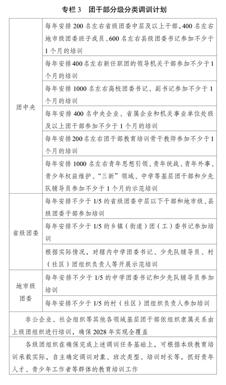 (二)堅持分級分類。根據(jù)各級團的領導機關干部、高校團干部、國有企業(yè)和機關事業(yè)單位單位團干部、中學團干部、鄉(xiāng)鎮(zhèn)(街道)團(工)委書記、村(社區(qū))團組織負責人、非公企業(yè)、社會組織等其他各領域基層團干部的不同對象特點,把團干部履職能力培訓的普遍性要求與不同類別、不同層級、不同崗位團干部的特殊需要結合起來,整合優(yōu)質資源,加強團干部教育培訓機構與黨校(行政學院)、干部學院、黨性教育基地等的合作聯(lián)動,多渠道多方面開展履職能力培訓,切實增強教育培訓的時代性、系統(tǒng)性、針對性、有效性。發(fā)揮中央團校、全國青少年井岡山革命傳統(tǒng)教育基地主體作用,圍繞黨的中心任務、黨中央重大決策部署和國家重大戰(zhàn)略需求開展專題培訓;發(fā)揮全國團干部教育培訓基地優(yōu)勢,開展政策解讀、重點任務落實等專題培訓;發(fā)揮地方團干部教育培訓機構優(yōu)勢,開展基層團干部實務培訓;發(fā)揮全國團干部教育培訓網(wǎng)絡平臺作用,抓好履職通識培訓;加強與派出單位、接收單位的協(xié)作,抓好援派幫扶干部人才、掛職干部等教育培訓。積極創(chuàng)造條件,支持干部在職自學。實施團干部分級分類調訓計劃(專欄3)。