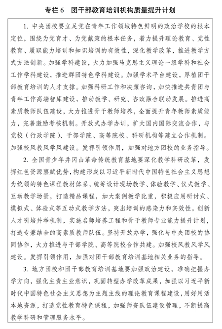 ?。ㄒ唬┡嘤枡C構建設。加強團干部教育培訓機構規(guī)范管理和質量提升,推進各級團校、團干部教育培訓基地建設,構建以中央團校、全國青少年井岡山革命傳統(tǒng)教育基地為龍頭,各級團校、團干部教育培訓基地相互補充、布局合理、規(guī)范有序的培訓機構體系,強化中央團校對地方團校的業(yè)務指導,不斷提高辦學水平。加強各類團干部教育培訓機構規(guī)范管理,開展團干部教育培訓機構辦學質量評估。支持各地各級團組織聯(lián)合開展培訓,鼓勵團干部教育培訓機構開展區(qū)域協(xié)作交流,推動優(yōu)質培訓資源共建共享。實施團干部教育培訓機構質量提升計劃(專欄6)。