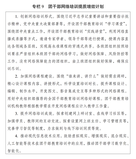 ?。ǘ┘訌娋W(wǎng)絡培訓課程建設。鼓勵團干部教育培訓機構開發(fā)精品網(wǎng)絡課程。注重把握網(wǎng)絡教學特點和規(guī)律,改進授課方式,提高制作水平,豐富呈現(xiàn)形式,提升課程質量。嚴把網(wǎng)絡課程政治關、質量關,規(guī)范講授、制作、審核、發(fā)布和更新、退出流程。充分發(fā)揮網(wǎng)絡培訓優(yōu)勢,推動優(yōu)質資源下基層。用好網(wǎng)絡直播培訓形式,增強現(xiàn)場體驗感。實施團干部網(wǎng)絡培訓提質增效計劃(專欄9)。