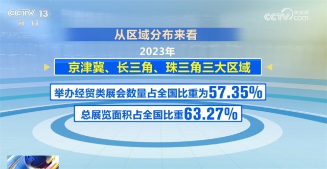從區(qū)域分布來(lái)看,2023年京津冀、長(zhǎng)三角、珠三角三大區(qū)域舉辦經(jīng)貿(mào)類(lèi)展會(huì)數(shù)量占全國(guó)比重為57.35%,總展覽面積占全國(guó)比重63.27%。