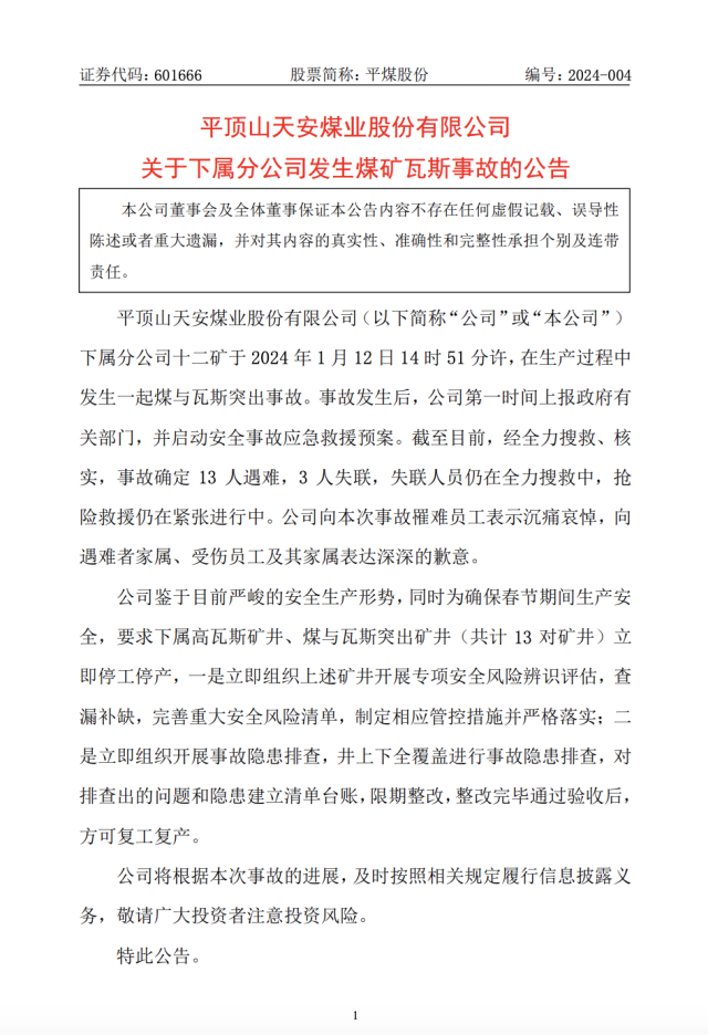 央視網(wǎng)消息:1月14日,平煤股份發(fā)布公告,下屬分公司十二礦于2024年1月12日14時51分許,在生產(chǎn)過程中發(fā)生一起煤與瓦斯突出事故。事故發(fā)生后,公司第一時間上報政府有關(guān)部門,并啟動安全事故應(yīng)急救援預(yù)案。截至目前,經(jīng)全力搜救、核實,事故確定13人遇難,3人失聯(lián),失聯(lián)人員仍在全力搜救中,搶險救援仍在緊張進(jìn)行中。公司向本次事故罹難員工表示沉痛哀悼,向遇難者家屬、受傷員工及其家屬表達(dá)深深的歉意。