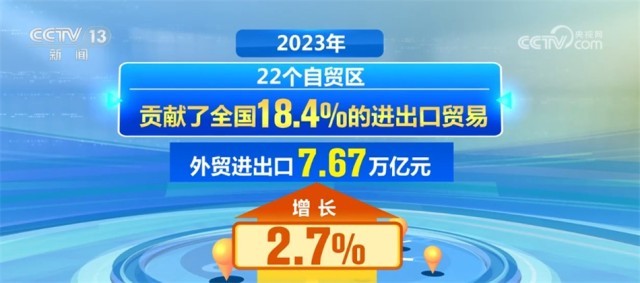 2023年,我國自貿(mào)試驗區(qū)擴容至22個。22個自貿(mào)區(qū)貢獻了全國18.4%的進出口貿(mào)易,外貿(mào)進出口7.67萬億元,增長2.7%。