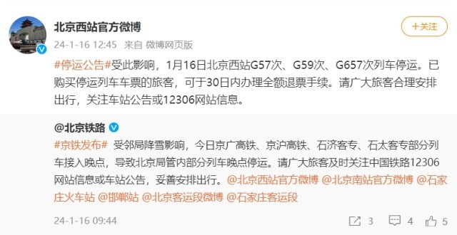 受降雪影響,1月16日北京西站G57次、G59次、G657次列車停運