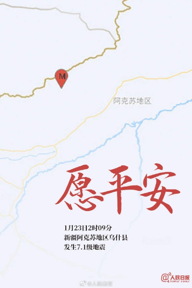 1月23日02時09分,在新疆阿克蘇地區(qū)烏什縣(北緯41.26度,東經(jīng)78.63度)發(fā)生7.1級地震,震源深度22公里。