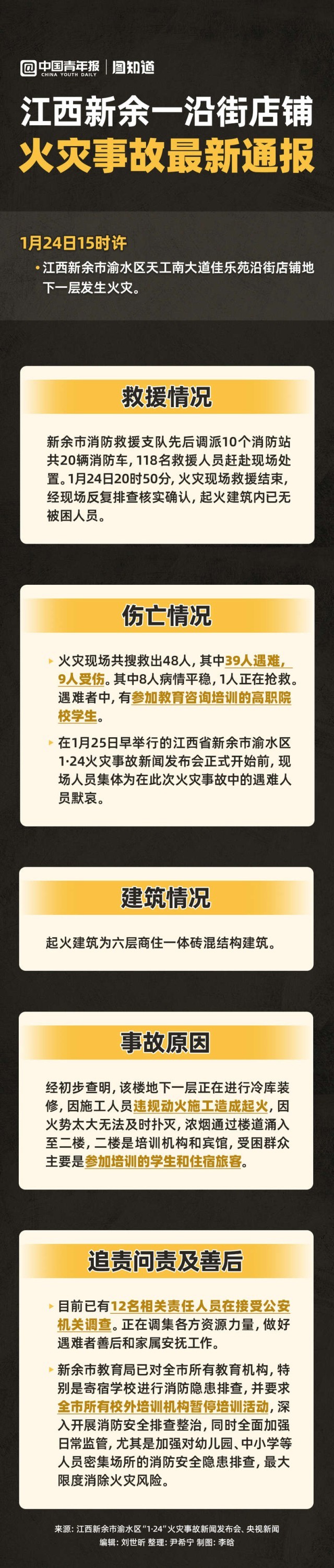 1月25日8時(shí),江西省新余市渝水區(qū)“1·24”火災(zāi)事故新聞發(fā)布會(huì)通報(bào),渝水區(qū)一沿街店鋪發(fā)生火災(zāi),造成39人遇難,9人受傷。遇難者中,有參加教育咨詢培訓(xùn)的高職院校學(xué)生。經(jīng)初步查明,事故原因系施工人員違規(guī)動(dòng)火施工造成起火。目前,已有12名相關(guān)責(zé)任人員接受公安機(jī)關(guān)調(diào)查。此外,新余市要求全市所有校外培訓(xùn)機(jī)構(gòu)暫停培訓(xùn)活動(dòng),深入開展消防安全排查整治。