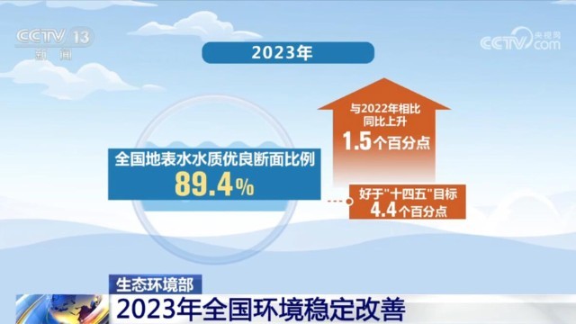據生態(tài)環(huán)境部,2023年全國地表水水質優(yōu)良斷面比例為89.4%,與2022年相比上升了1.5個百分點;長江、黃河干流全線水質穩(wěn)定保持在二類;全國地下水一類至四類水質點位比例為77.8%,同比上升0.2個百分點;全國近岸海域優(yōu)良海水水質面積比例為85%,同比上升3.1個百分點。