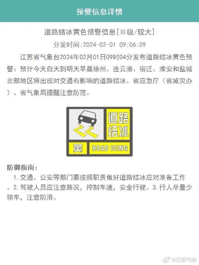 江蘇省氣象臺發(fā)布道路結(jié)冰黃色預(yù)警