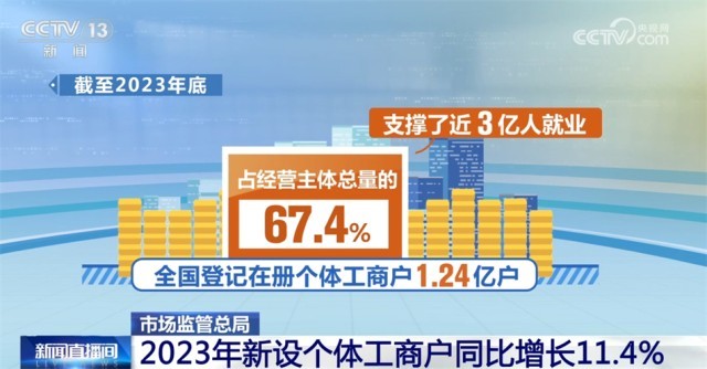 截至2023年底,全國登記在冊(cè)個(gè)體工商戶1.24億戶,占經(jīng)營主體總量的67.4%,支撐了近3億人就業(yè);全年新設(shè)個(gè)體工商戶2258.2萬戶,同比增長11.4%。