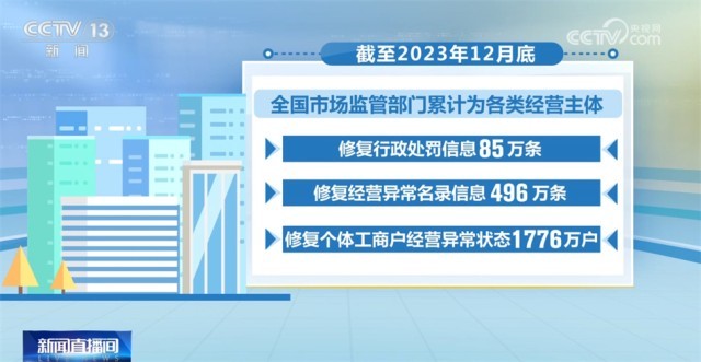 截至2023年12月底,全國市場(chǎng)監(jiān)管部門累計(jì)為各類經(jīng)營主體修復(fù)行政處罰信息85萬條,修復(fù)經(jīng)營異常名錄信息496萬條,修復(fù)個(gè)體工商戶經(jīng)營異常狀態(tài)1776萬戶。