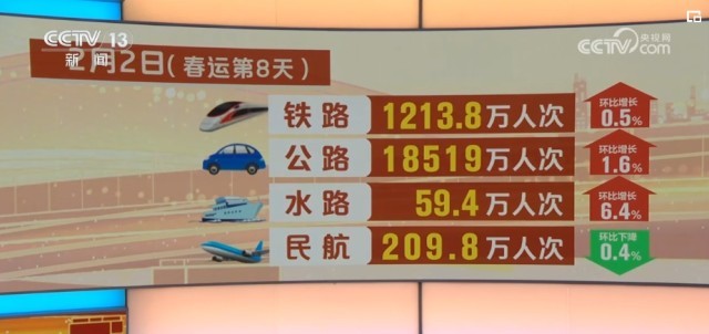 2024年綜合運(yùn)輸春運(yùn)工作專班數(shù)據(jù)顯示,春運(yùn)前8天,超15.5億人次出行。2月2日,也就是春運(yùn)第八天,全社會跨區(qū)域人員流動(dòng)量超2億人次,為2024年春運(yùn)以來跨區(qū)域人員流動(dòng)最多的一天。