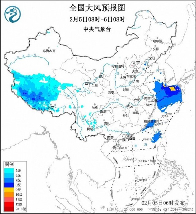 預(yù)計,2月5日08時至6日08時,西藏中西部、青海西南部等地將有5~7級、陣風(fēng)8級的大風(fēng);黃海南部海域、東海大部海域、臺灣海峽、巴士海峽將有7~8級、陣風(fēng)9級的大風(fēng),其中黃海東南部、東海東北部的部分海域風(fēng)力可達9級、陣風(fēng)10級。