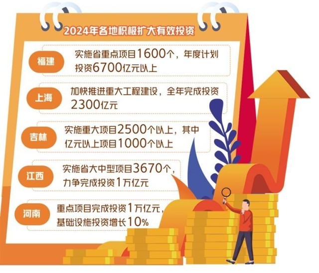 各地2024年政府工作報告中對今年如何擴大有效投資進行了系統(tǒng)部署,不少地方還公布了具體金額。比如,福建將謀劃實施省重點項目1600個、年度計劃投資6700億元以上;上海今年將加快推進重大工程建設(shè),全年完成投資2300億元;吉林今年計劃實施重大項目2500個以上,其中億元以上項目1000個以上;江西今年實施省大中型項目3670個,力爭完成投資1萬億元;河南重點項目完成投資1萬億元,基礎(chǔ)設(shè)施投資增長10%;安徽開展先進制造業(yè)投資“領(lǐng)跑”計劃,制造業(yè)投資增長10%以上。
