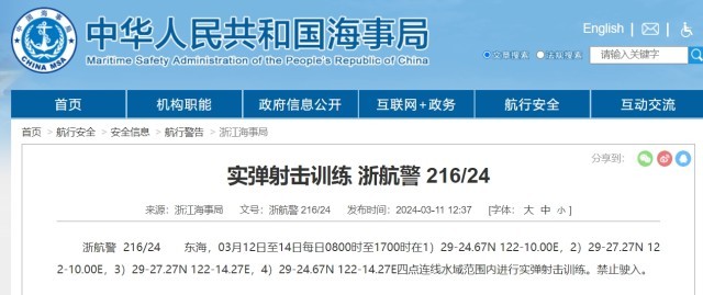 央視網(wǎng)消息:據(jù)中國海事局網(wǎng)站消息,浙江海事局發(fā)布航行警告,3月12日至14日每日8時(shí)至17時(shí),東海部分水域進(jìn)行實(shí)彈射擊訓(xùn)練,禁止駛?cè)搿?/p>