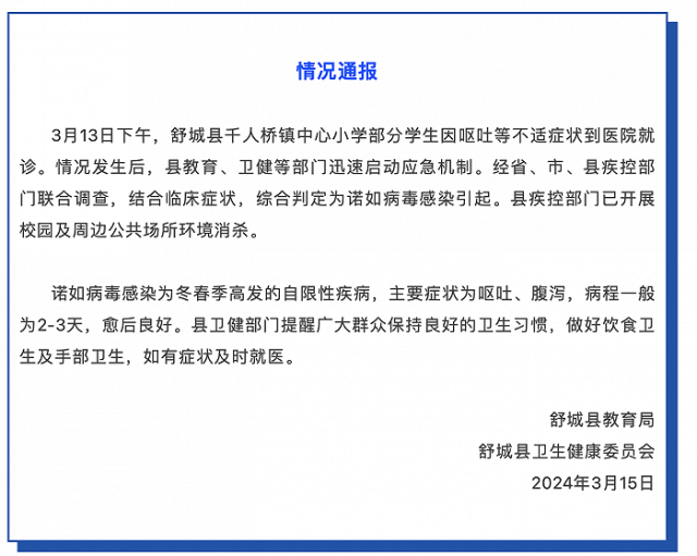 安徽舒城通報一小學多名學生腹痛嘔吐:綜合判定為諾如病毒感染引起