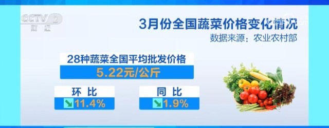 3月份,農(nóng)業(yè)農(nóng)村部監(jiān)測的28種蔬菜全國平均批發(fā)價(jià)格為每公斤5.22元,環(huán)比下降11.4%,同比下降1.9%。分品種看,23種蔬菜價(jià)格環(huán)比下降,5種上漲,其中降幅較大的品種有菠菜、黃瓜、生菜和青椒。