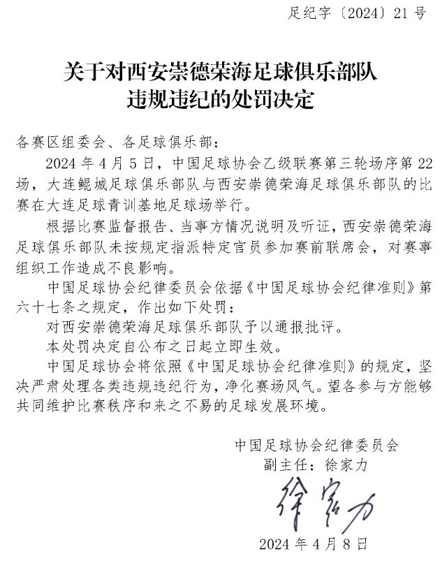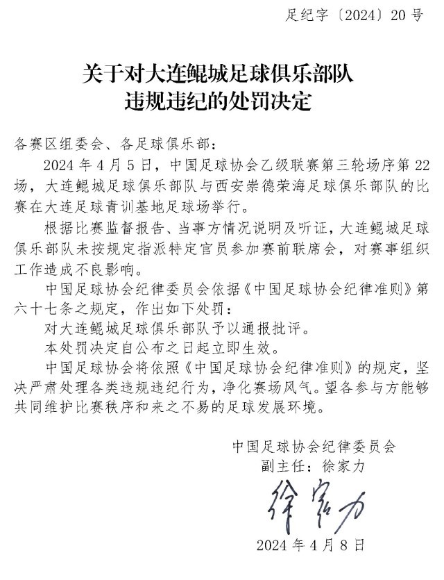 央視網(wǎng)消息:4月10日,中國足協(xié)網(wǎng)站發(fā)布《關(guān)于對上海嘉定匯龍足球俱樂部隊(duì)球員時(shí)間違規(guī)違紀(jì)的處罰決定》《關(guān)于對西安崇德榮海足球俱樂部隊(duì)違規(guī)違紀(jì)的處罰決定》《關(guān)于對大連鯤城足球俱樂部隊(duì)違規(guī)違紀(jì)的處罰決定》三份處罰決定。中甲聯(lián)賽上海嘉定匯龍9號球員因暴力行為被停賽罰款。中乙聯(lián)賽大連鯤城與西安崇德榮海兩家俱樂部因未按規(guī)定指派特定官員參加賽前聯(lián)席會(huì),被通報(bào)批評。