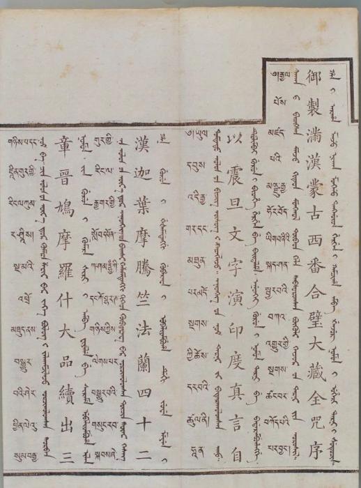 康熙皇帝特別注重刊行蒙古文《甘珠爾》以“利于祭誦”,康熙五十六年(1717年)下令刊刻蒙古文《甘珠爾》。到了乾隆三十二年(1767年),傅恒上書提出,要讓僧人念經(jīng)念得準(zhǔn),需要標(biāo)明原音、輔音的韻腳和切音,最好能看著漢字就能念出梵音(“禮今教習(xí)僧人持念咒語止,須明曉阿禮嘎禮音韻反切,自能對漢字而得梵音”)。于是,為方便蒙古地區(qū)僧人念誦咒語,《御制滿漢西番合璧大藏全咒》添譯了蒙古文。蒙古文《大藏經(jīng)》是蒙古族歷史文化發(fā)展的里程碑,也是蒙古族已知最大部頭的古籍。在譯經(jīng)過程中,蒙古文字也得到了充分錘煉與發(fā)展,提高了交流與表現(xiàn)能力。