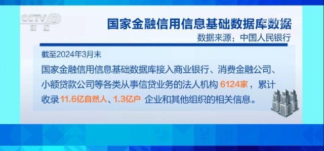 截至2024年3月末,國家金融信用信息基礎數(shù)據庫接入商業(yè)銀行、消費金融公司、小額貸款公司等各類從事信貸業(yè)務的法人機構6124家,累計收錄11.6億自然人、1.3億戶企業(yè)和其他組織的相關信息。