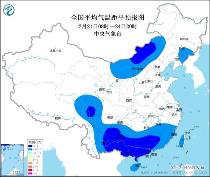 受持續(xù)陰雨雪和冷空氣共同影響,我國南方大部地區(qū)氣溫將顯著偏低。預(yù)計(jì)21日08時(shí)至24日20時(shí),貴州、四川西部和南部、湖南南部、江西中南部、云南東部、廣西、廣東、福建、海南和臺(tái)灣島等地的日平均氣溫較歷史同期偏低5℃以上,其中,云南東部、貴州南部、湖南南部、江西南部、廣西大部、廣東中西部等地偏低7℃以上,最低氣溫0℃線將壓至貴州南部、湖南南部、江西北部到浙江南部一帶,4℃線將壓至廣西中部到廣東中部一帶。另外,內(nèi)蒙古中部、吉林、青藏高原東部等地日平均氣溫也較歷史同期偏低5℃,部分地區(qū)偏低7℃。(見圖1、圖2)。