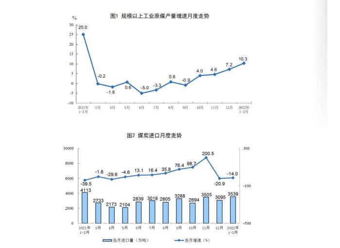 原煤生產較快增長,進口降幅收窄。1—2月份,生產原煤6.9億噸,同比增長10.3%,增速比上年12月份加快3.1個百分點,日均產量1164萬噸。進口煤炭3539萬噸,同比下降14.0%,降幅比上年12月份收窄6.9個百分點。