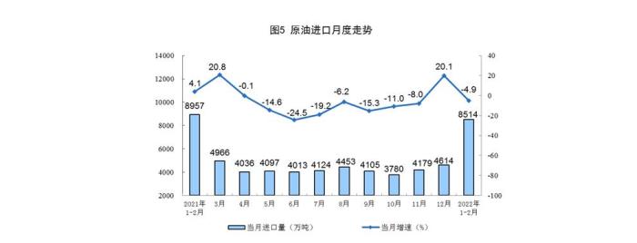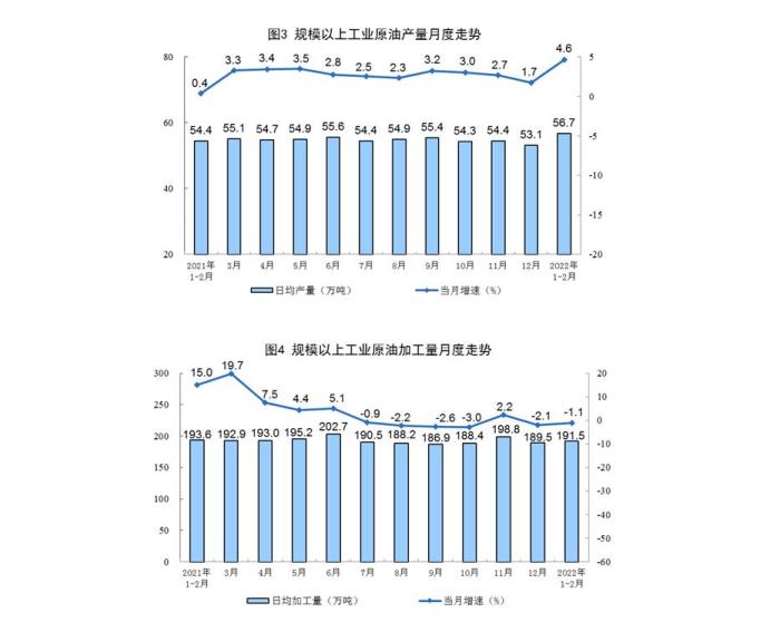 原油生產穩(wěn)定增長,進口由增轉降。1—2月份,生產原油3347萬噸,同比增長4.6%,增速比上年12月份加快2.9個百分點,日均產量56.7萬噸。進口原油8514萬噸,同比下降4.9%,上年12月份為增長20.1%。