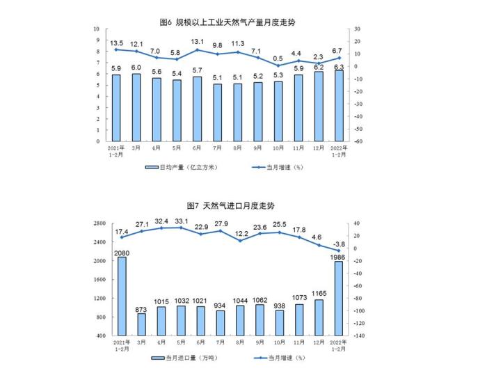 天然氣生產保持增長,進口下降。1—2月份,生產天然氣372億立方米,同比增長6.7%,增速比上年12月份加快4.4個百分點,日均產量6.3億立方米。進口天然氣1986萬噸,同比下降3.8%,上年12月份為增長4.6%。