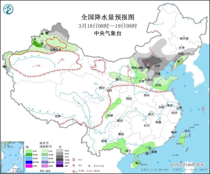 3月18日8時(shí)至19日8時(shí),新疆北北疆大部和南疆西部山區(qū)、內(nèi)蒙古中部、陜西北部、山西北部、京津冀大部、山東中北部、遼寧大部、吉林東南部等地部分地區(qū)有小到中雪或雨夾雪,其中,河北北部、內(nèi)蒙古中部偏南地區(qū)、遼寧中部、新疆北疆西北部等地部分地區(qū)有大到暴雪。新疆伊犁河谷、陜西中部、山東南部、四川盆地西北部、云南東南部、廣西西部、廣東西南部、海南島、臺(tái)灣島等地部分地區(qū)有小雨,局地中雨。內(nèi)蒙古中西部、新疆南疆盆地、陜西北部等地部分地區(qū)有4~6級(jí)風(fēng)。