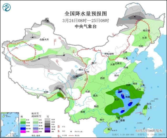3月24日08時至25日08時,新疆北疆北部和南疆盆地西部、西藏東部、青海南部和西部、甘肅南部和河西、川西高原北部、內(nèi)蒙古東部、黑龍江、吉林西部和東部等地部分地區(qū)有小到中雪或雨夾雪,其中,內(nèi)蒙古東北部、黑龍江西部、新疆北疆北部、西藏東北部、青海東南部等地部分地區(qū)有大到暴雪(10~12毫米)。湖北東南部、江西大部、福建西部和中部、廣東中北部、廣西東部等地部分地區(qū)有大雨,其中,湖北東南部、江西西北部、福建西部、廣東北部等地部分地區(qū)有暴雨(50~80毫米)。新疆、西北地區(qū)大部、內(nèi)蒙古中西部等地部分地區(qū)有4~6級風,其中,內(nèi)蒙古西部、新疆東部、青海西部等地部分地區(qū)有6~7級風(見圖4)。