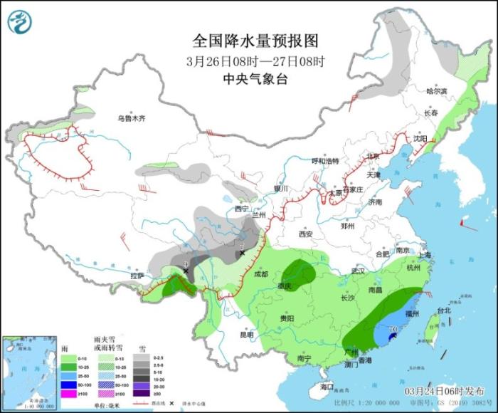 圖3 全國降水量預(yù)報圖(3月25日08時-26日08時)
