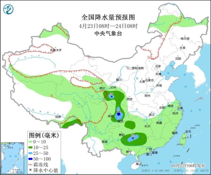 圖1 全國降水量預(yù)報圖(4月22日08時-23日08時)