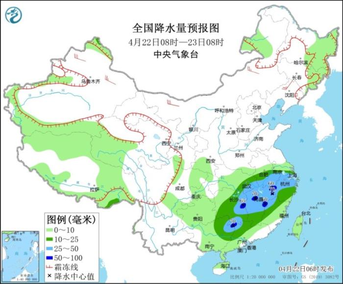 4月22日08時至23日08時,新疆北疆北部、青海南部、西藏北部等地部分地區(qū)有小到中雪或雨夾雪,局地有大到暴雪。江淮南部、江漢東部、江南大部、華南北部等地部分地區(qū)有中到大雨,其中,安徽南部、湖南東部、江西中北部、浙江西部、廣西東北部等地局地有暴雨(50~70毫米)。新疆北部、內(nèi)蒙古、東北南部等地部分地區(qū)有4~6級風(見圖1)。