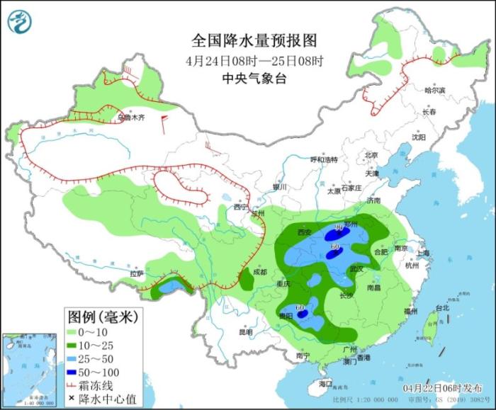 4月24日08時至25日08時,新疆北疆北部、青海南部、西藏北部等地部分地區(qū)有小到中雪或雨夾雪。西藏東南部、西北地區(qū)東南部、西南地區(qū)東部、黃淮西部、江淮西部、江漢、江南北部、華南北部等地部分地區(qū)有中到大雨,其中,河南西南部、湖北北部、貴州東南部等地部分地區(qū)有暴雨(50~90毫米)。內(nèi)蒙古西北部、新疆北疆北部等地部分地區(qū)有4~6級風,其中,新疆東部部分地區(qū)有6~8級風(見圖3)。