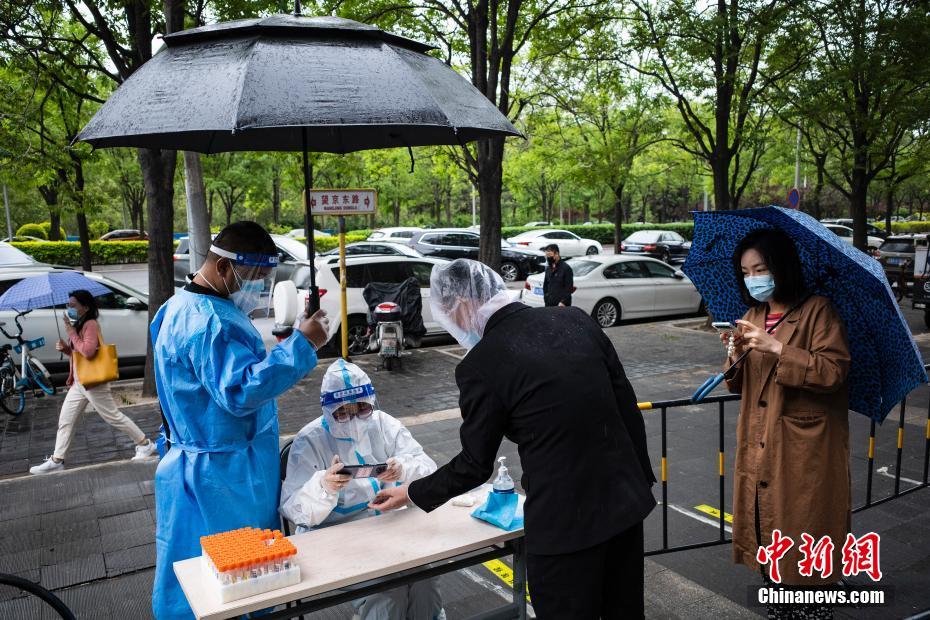 4月27日,生活、工作在北京市朝陽區(qū)的民眾冒雨參加第二次常態(tài)化核酸檢測。朝陽區(qū)已于4月25日進行了首次常態(tài)化核酸檢測,4月29日還將進行第三次。圖為一位男士在核酸檢測點信息登記處登記信息。 中新社記者 侯宇 攝