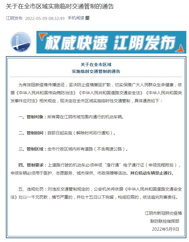 中新網(wǎng)5月9日電 據(jù)“江陰發(fā)布”微信公眾號(hào)消息,江蘇省江陰市新冠肺炎疫情聯(lián)防聯(lián)控指揮部9日發(fā)布關(guān)于在全市區(qū)域?qū)嵤┡R時(shí)交通管制的通告。通告稱(chēng),為有效阻斷疫情傳播途徑,堅(jiān)決防止疫情蔓延擴(kuò)散,切實(shí)保障廣大人民群眾生命健康,依據(jù)《中華人民共和國(guó)傳染病防治法》《中華人民共和國(guó)道路交通安全法》《中華人民共和國(guó)突發(fā)事件應(yīng)對(duì)法》相關(guān)規(guī)定,現(xiàn)決定在全市區(qū)域?qū)嵤┡R時(shí)性交通管制。