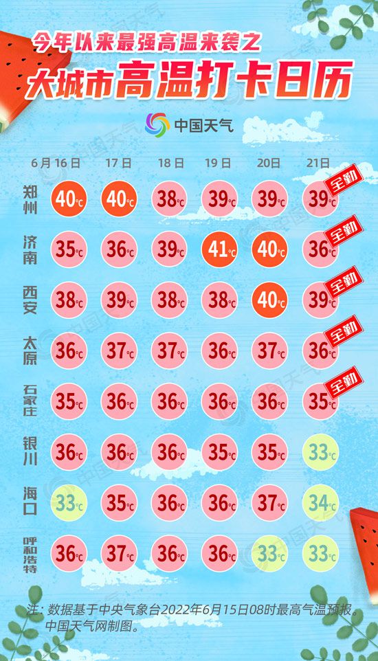 中國(guó)天氣網(wǎng)訊 今年以來(lái)最強(qiáng)高溫來(lái)襲!今(6月15日)起到22日,北方高溫強(qiáng)勢(shì)返場(chǎng),鄭州、濟(jì)南等地最高氣溫可達(dá)40℃或以上,部分地區(qū)高溫持續(xù)時(shí)間之長(zhǎng)、強(qiáng)度之強(qiáng)都是同期少見(jiàn)。中國(guó)天氣網(wǎng)推出大城市高溫打卡日歷,看哪些地方未來(lái)6天高溫全勤到崗。