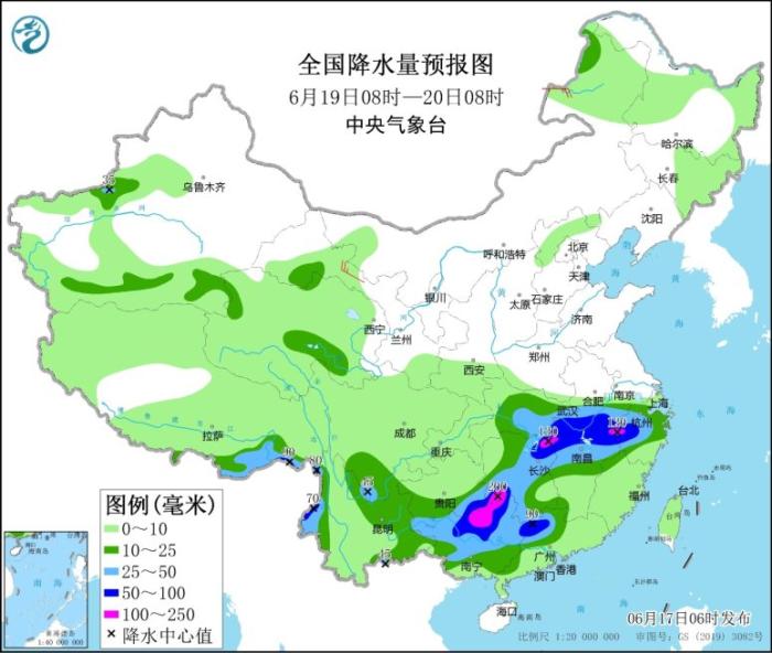 6月19日08時(shí)至20日08時(shí),江淮西南部、江南中北部和西部、華南中西部以及西南地區(qū)南部、西藏東南部等地的部分地區(qū)有中到大雨,其中,貴州東南部、湖北東南部、安徽南部、湖南東北部和中南部、江西北部、浙江中西部、廣西中北部、廣東北部、云南西北部等地部分地區(qū)有暴雨,局地大暴雨(100~200毫米)。內(nèi)蒙古東北部、甘肅西部等地的部分地區(qū)有4~6級(jí)風(fēng);北部灣、南海西北部和中西部將有5~6級(jí)、陣風(fēng)7級(jí)的偏南到西南風(fēng)。