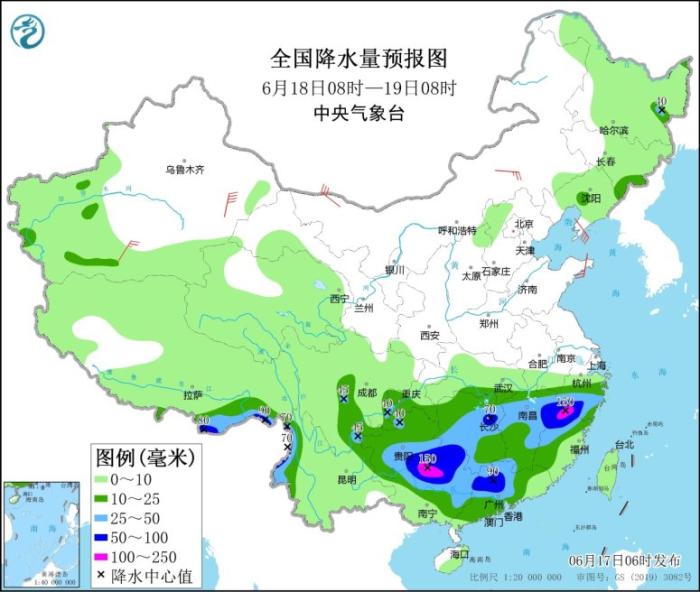 6月17日08時(shí)至18日08時(shí),廣東大部、廣西北部和中東部、福建西部和北部、貴州南部和東部、湖南西部和南部、江西中南部、浙江南部以及云南西北部、西藏東南部等地的部分地區(qū)有大到暴雨,局地大暴雨(100~180毫米)。新疆沿天山地區(qū)和南疆盆地、內(nèi)蒙古中西部、西藏中西部等地的部分地區(qū)有4~6級(jí)風(fēng),其中新疆東部部分地區(qū)風(fēng)力可達(dá)7級(jí)以上;東海南部、臺(tái)灣以東洋面、北部灣將有5~6級(jí)、陣風(fēng)7級(jí)的偏南到西南風(fēng)。